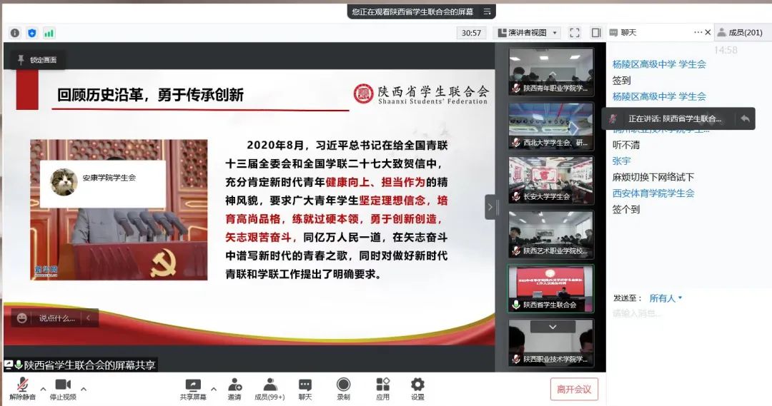 4月14日下午,陕西省学联学生会组织开展2022年春季学期陕西省学联学生会组织主要学生骨干集体培训,省学联副秘书长苏磊、陕西省学生联合会执行主席田博文出席会议,全省各高校学生会参加线上培训。团委在9号楼217室设立分会场,学生会秘书长赵冰玉,院学生会主席团成员,各系(部)学生会主席参加培训。