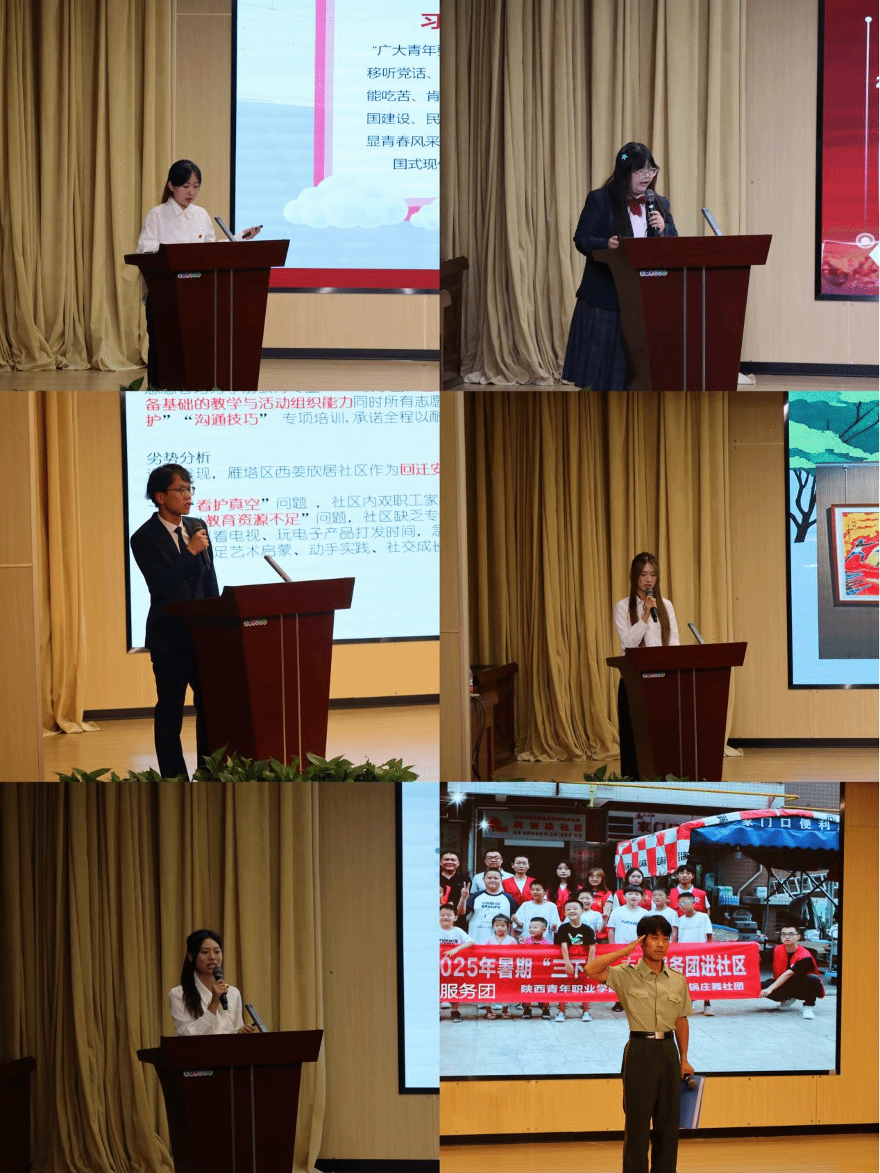会上,12支社会实践队首先通过视频展示、PPT汇报等形式,分享了我校师生们满怀热情与责任,走进乡村、深入社区、扎根基层,用脚步丈量祖国大地,用眼睛发现时代变迁的生动故事。无论是在支教课堂上为社区儿童开设兴趣课程,传递2025-09-28知识火种,还是在乡村调研中从帮助农户探寻发展路径到记录乡村振兴的鲜活故事,每一支团队都交出了独特的“青春答卷”,每一位同学都在实践中收获了成长,践行青春担当。