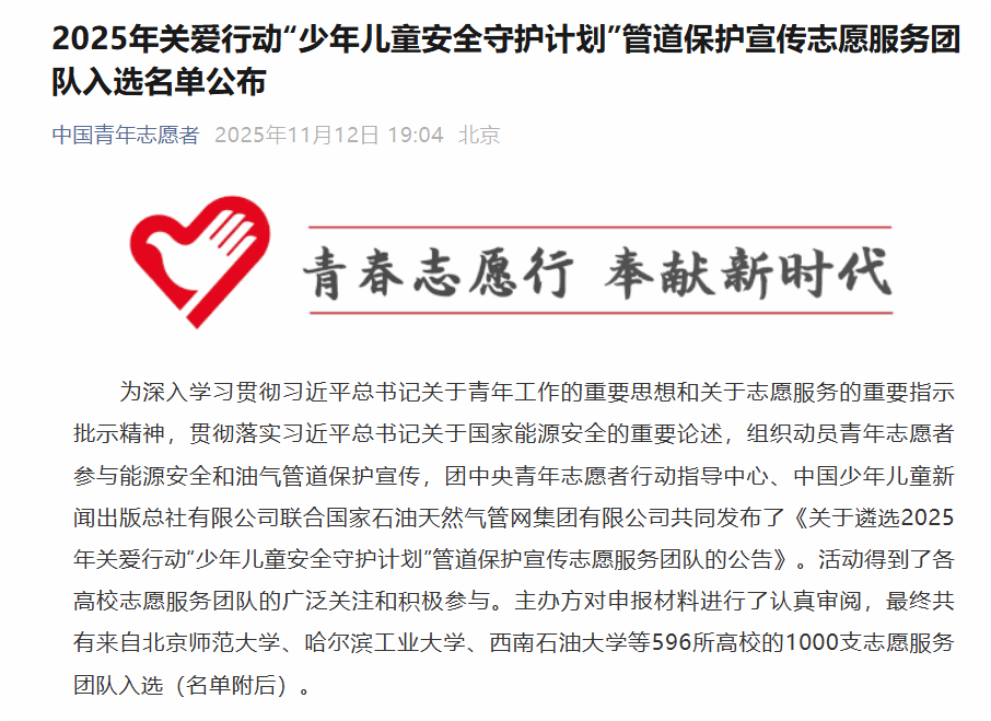 近日,我校青柠护安志愿服务队入选团中央青年志愿者行动指导中心等单位联合发起的2025年关爱行动“少年儿童安全守护计划”管道保护宣传志愿服务团队。在此次遴选活动中,陕西省共有27支高校团队入选,其中职业院校团队仅5支,我校团队的入选彰显了学校在全省职业院校志愿服务领域的实力,也体现了青年学子的责任担当。